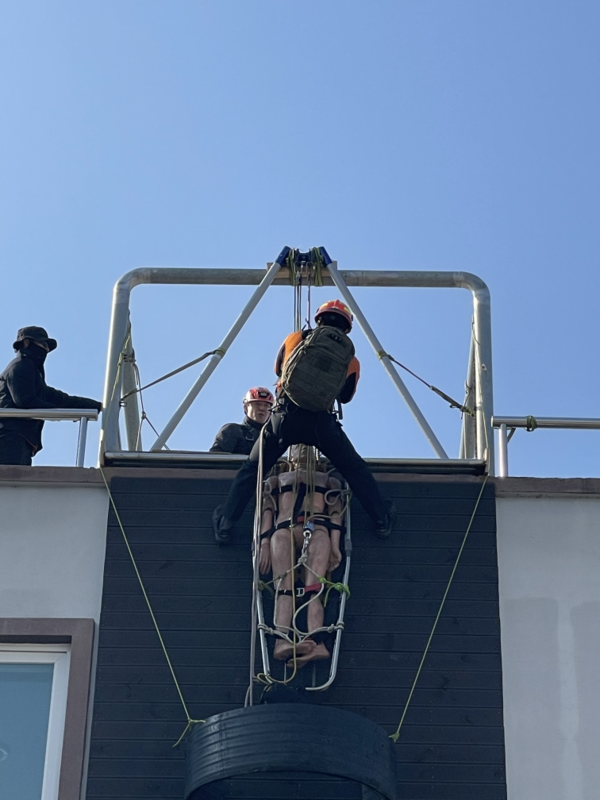 구조분야 응용구조는 ▲장비점검 착용·장비휴대 및 전술 구간 이동 ▲확보지점 및 로프설치(1단계) ▲구조대원·들 것 하강(2단계) ▲들것 결착 및 수직 당김 시스템 설치(3단계) ▲들 것 인양 및 장애물 통과(4단계) ▲들 것 인양 완료 및 종료(5단계) 순서이다