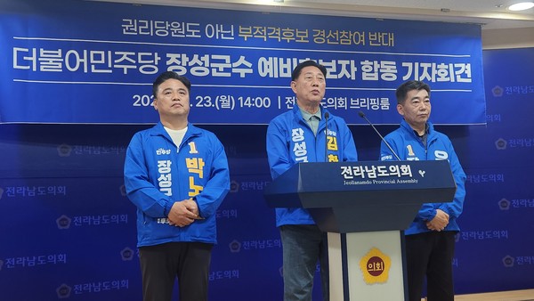 더불어민주당 장성군수 선거에 나선 김한종 장성군수, 박노원 전 청와대 행정관, 유성수 전 도의원(가나다순) 등 예비후보 3인이 23일, 전남도당과 중앙당의 불투명한 예비후보 자격심사 과정을 규탄하며 전남도의회에서 공동 성명서를 발표했다.